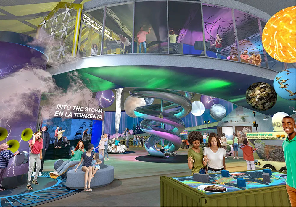 Into The Storm sweeps visitors away into tales of wind, hail, and snow. In this iconic FMSM experience, visitors can hurtle through a multi-sensory slide, ascend a winding exhibit-packed ramp, and catch the sight of unique weather events and data visualizations projected onto free-floating weather balloons. Talking about the weather offers a time-honored way for people to engage with each other at the intersection of STEMM, community values, and trust.
