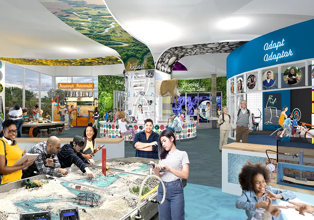This zone provides layers of low-barrier STEMM entry points, even for those who feel “a museum is not the place for me.” From pop-culture to robots, visitors can test the limits of artificial intelligence or program a techno dinosaur. Science + Fiction’s permanent ag tech subzone nourishes understandings of soil, seeds, and sun as it feeds our imaginations.